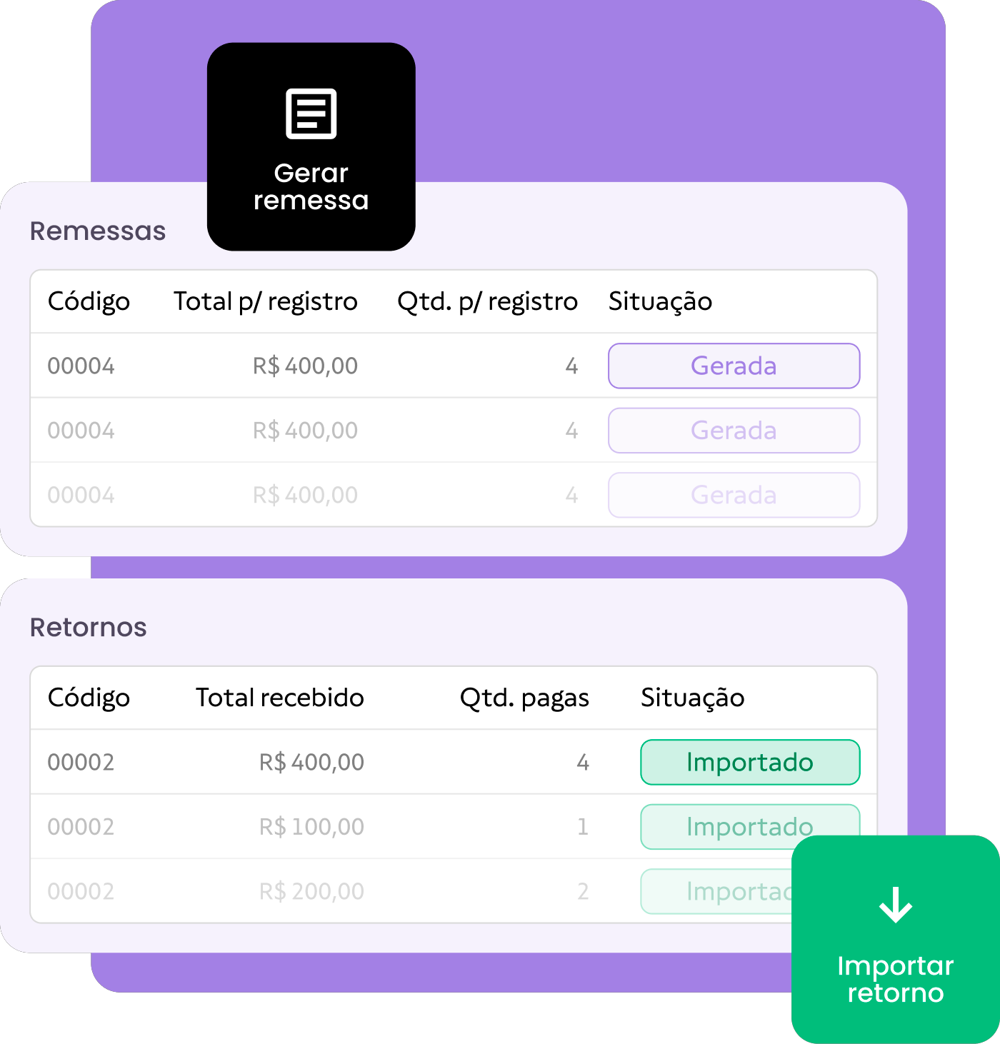 Tudo que é atualizado por remessa e retorno reflete automaticamente nos relatórios e conciliações.