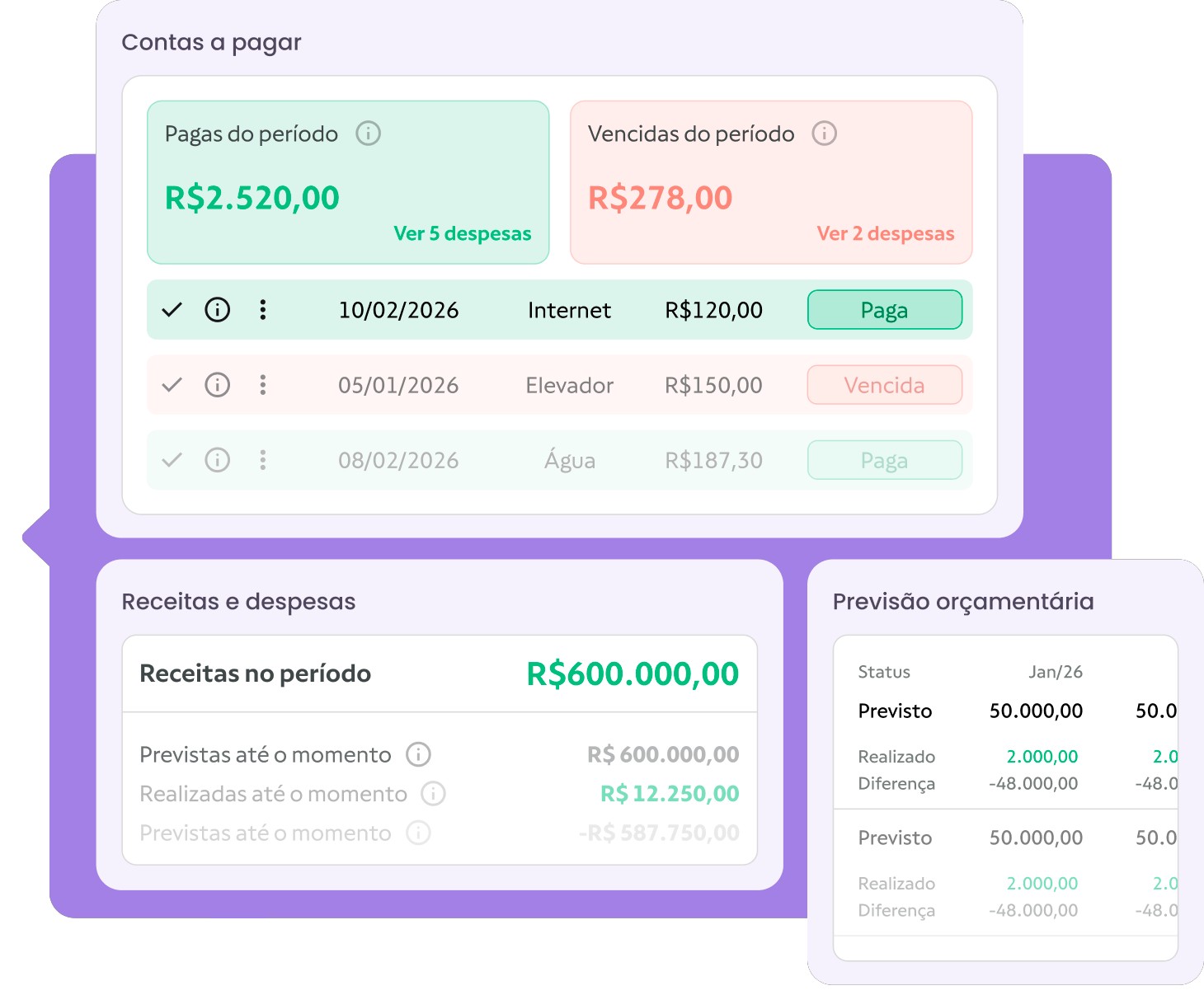 Organize contas bancárias e fundos internos (como obras e reservas) em uma interface prática;