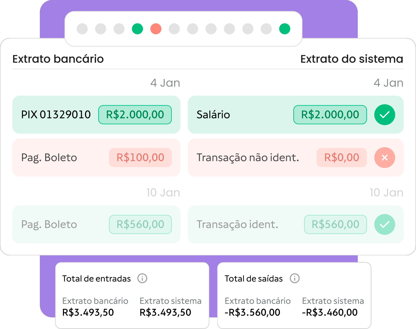 A partir do arquivo OFX do banco, o sistema identifica qualquer divergência entre o que aconteceu na conta bancária e o que está registrado no sistema. Isso evita erros, retrabalhos e inconsistências comuns no controle manual.